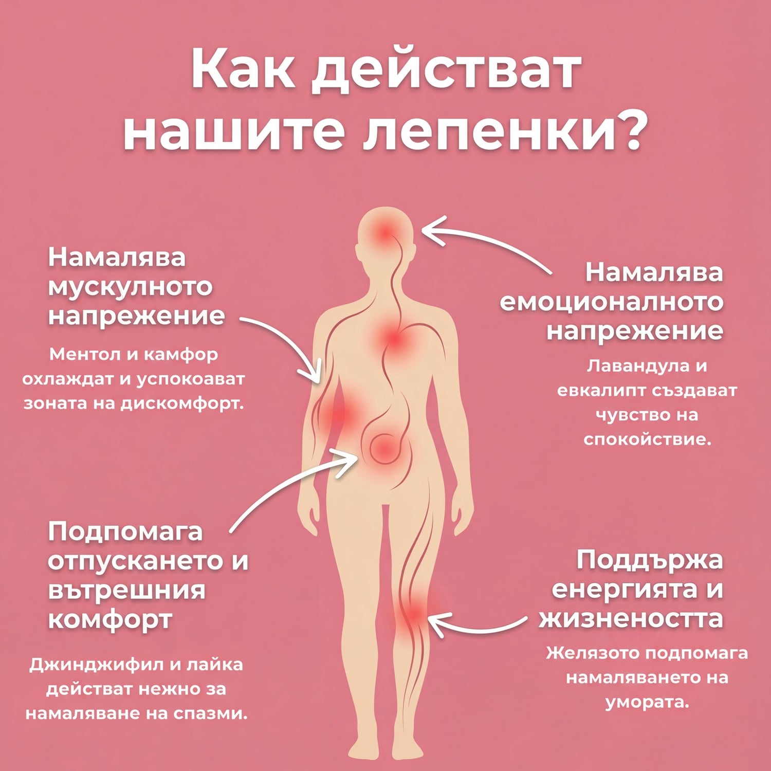 Нашите лепенки намаляват болката и крампите, отпускат мускулите и облекчават дискомфорта по естествен начин. С комбинация от джинджифил, лайка, лавандула и евкалипт осигуряват до 8 часа спокойствие, баланс и по-добро настроение. Удобни и лесни за употреба – просто се поставят върху кожата и действат през целия ден.