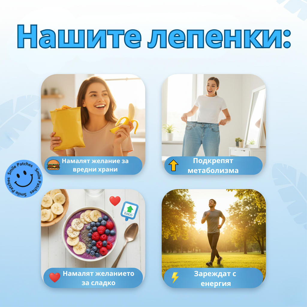 Нашите лепенки намаляват желанието за похапване и подкрепят здравословното намаляване или поддържане на теглото. Стабилизират енергията през деня и подпомагат на метаболизма. Удобни и лесни за употреба – просто се поставят върху кожата и действат през целия ден.